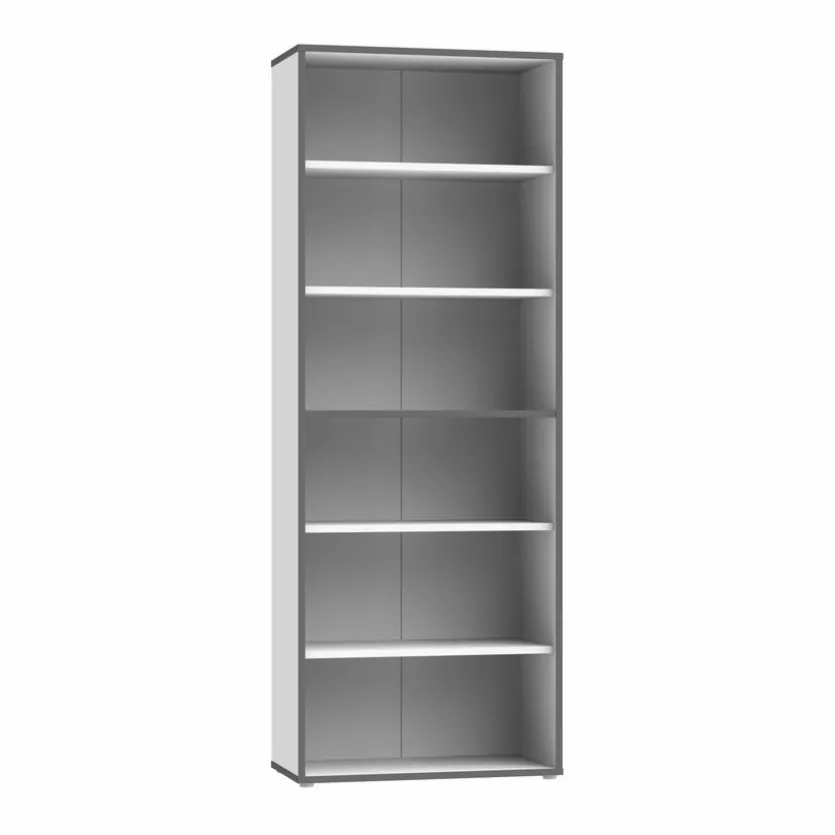 - Aus Holzwerkstoff (Spanplatte) in Weiß, Kontrastkante aus Holzwerkstoff (Spanplatte) in Uni Wolfram Grau, Rückwand aus Holzwerkstoff (HDF-Platten) in Weiß
