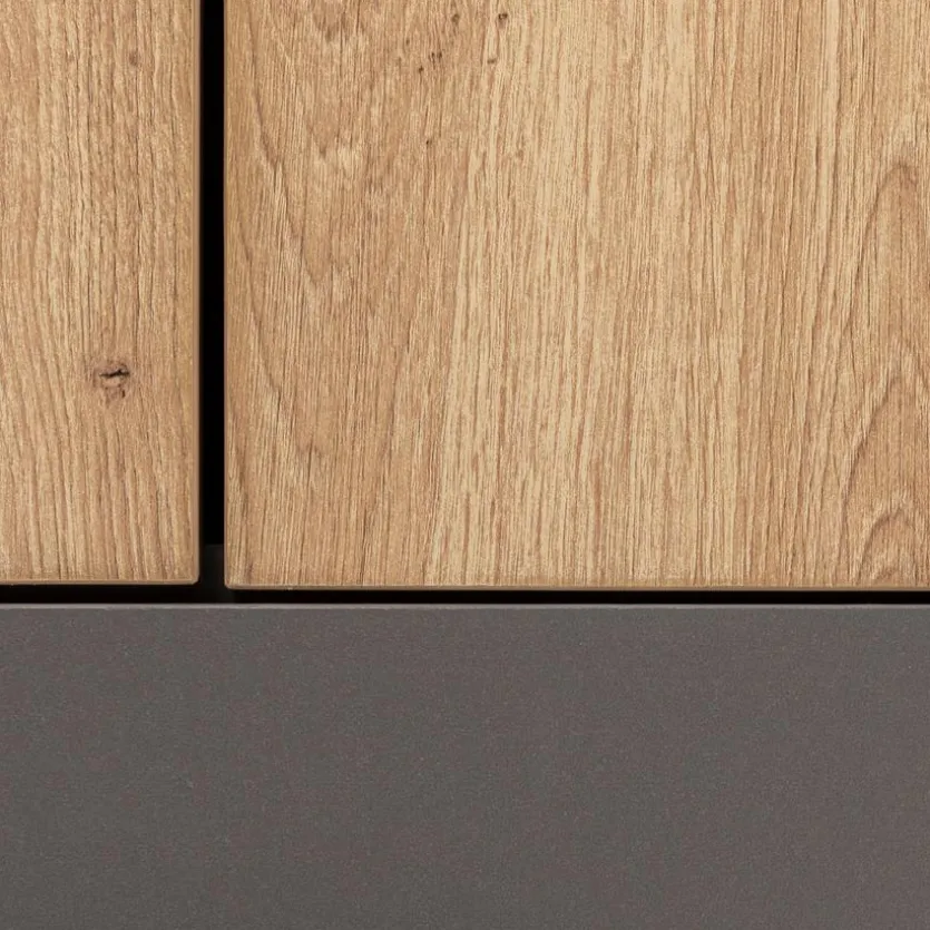 - Aus Holzwerkstoff (Spanplatte) mit hochwertiger Dekorfolie in „Kent Eiche“, Absetzung aus Holzwerkstoff (Spanplatte) mit hochwertiger Dekorfolie in Anthrazit, Griffe aus Metall in anthrazit