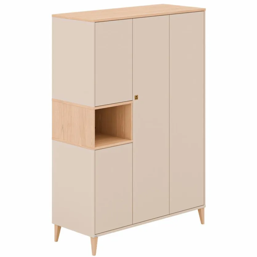- Aus Spanplatte mit kratzfester Melaminharzfolie in Cashmere-Beige, Deckplatten und Absetzung von Kommode, Schrank und Wickelaufsatz aus Spanplatte mit kratzfester Melaminharfolie in Skandinavian Wood, Bett und Füße aus Massivholz in Buche