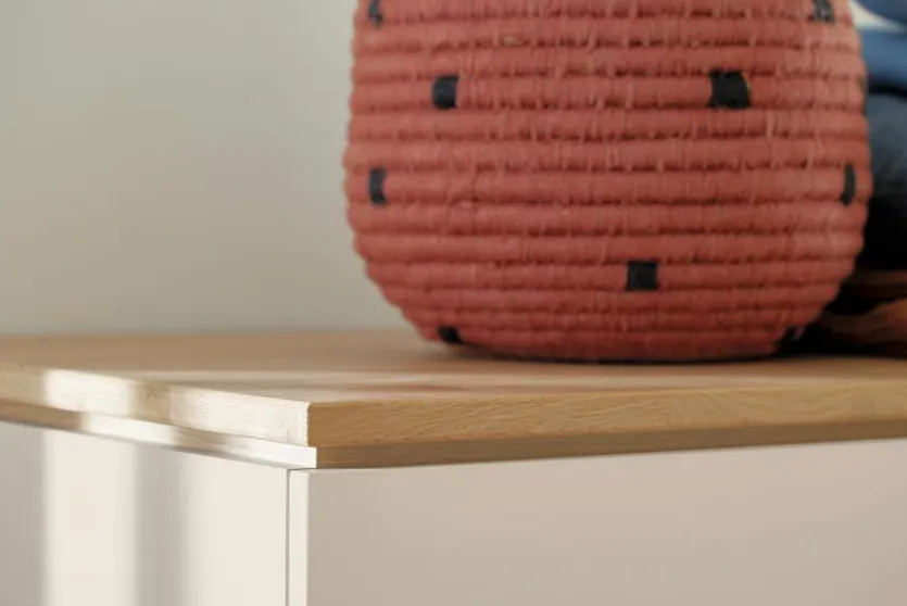 - Aus Holzwerkstoff (Spanplatte) mit kratzfester Melaminharzfolie in Cashmere-Beige, Füße, Griffe, Sockel und Deckplatte sowie Fries des Babybettes aus massiver Eiche