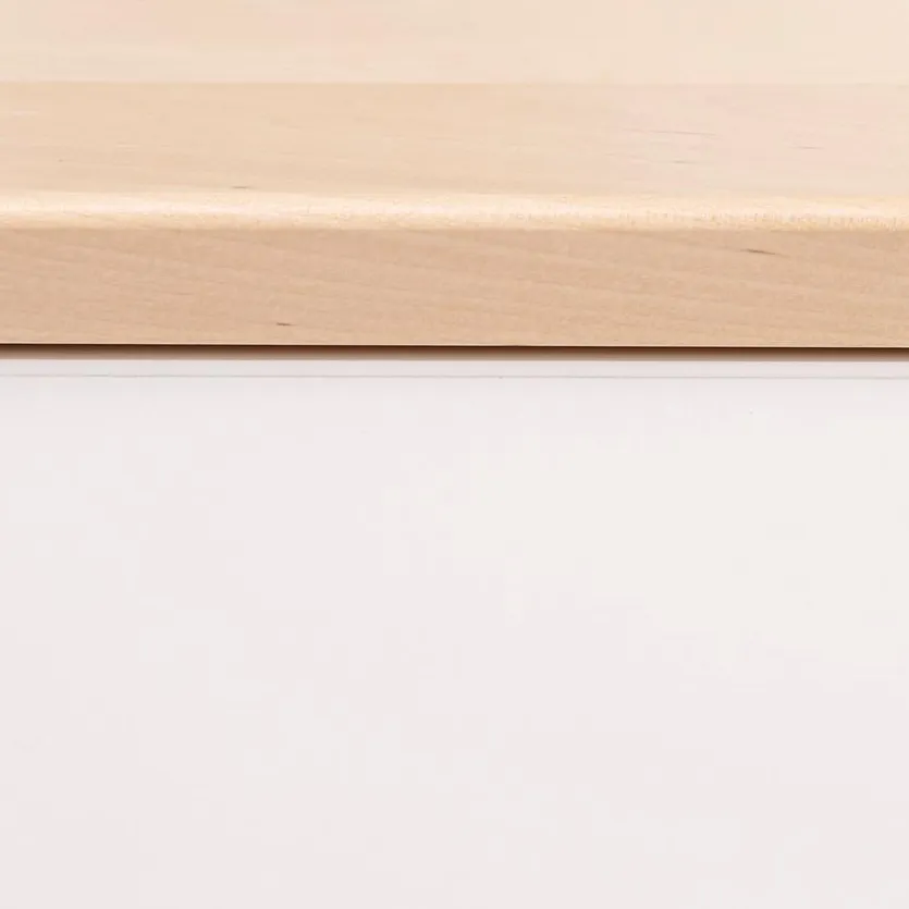- Aus Spanplatte mit kratzfester Melaminharzfolie in Kreideweiß, Füße, Deckplatte und Absetzungen aus massiver Birke
