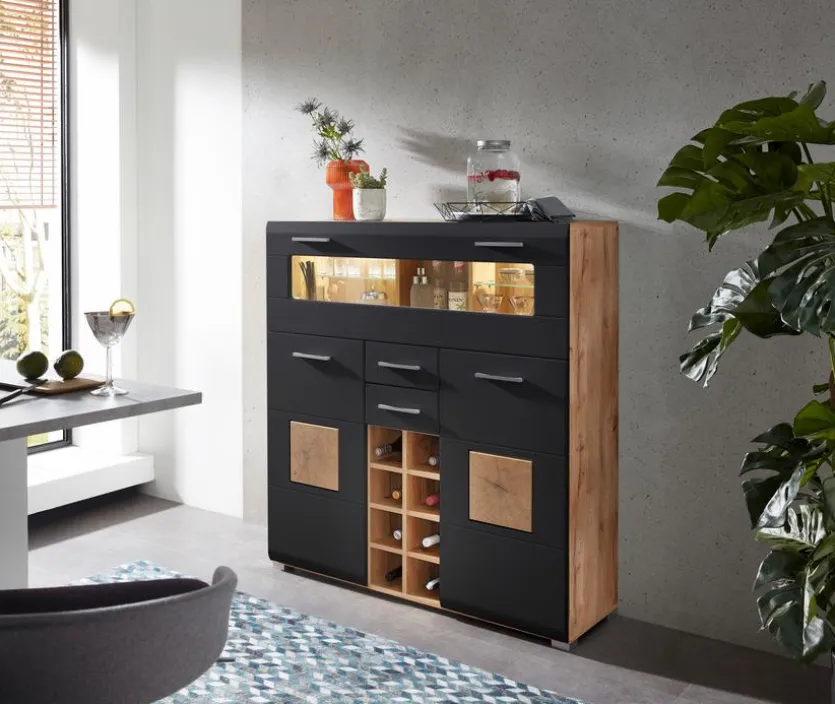 - 2-trg., mit 1 Glas-/Holzklappe, 2 Schubkästen und 1 Flaschenregal