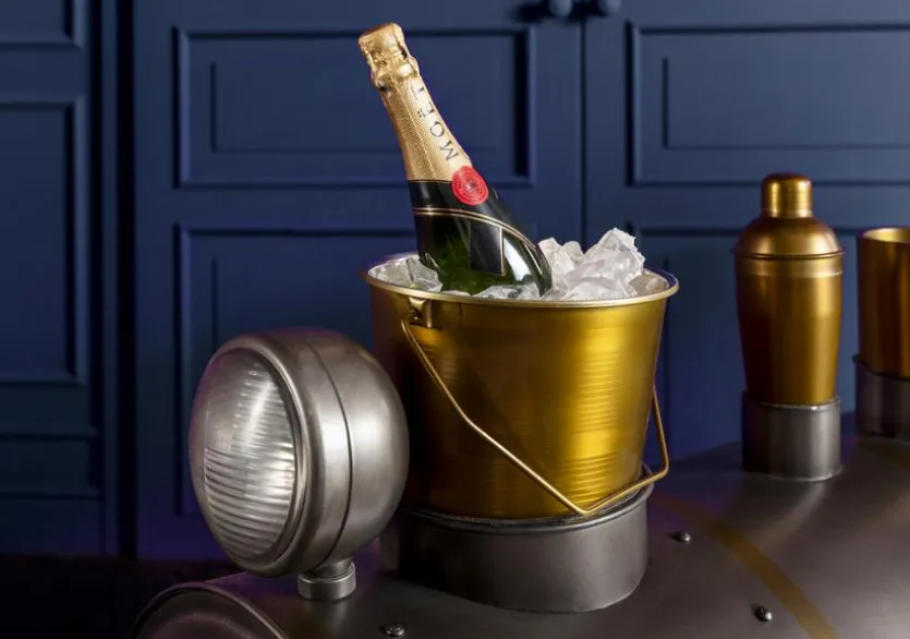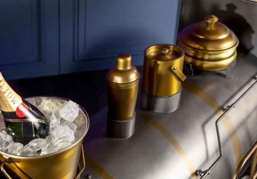 - Mit 2 Glashalter für 10 Gläser, 1 Sektkühler, 1 Weinkühler, 1 Shaker und 1 geschlossenem Bahälter