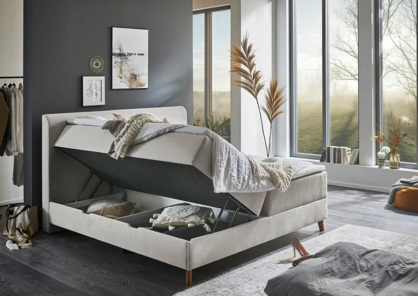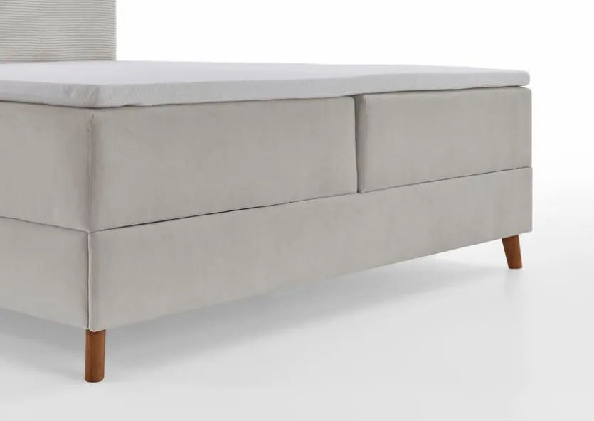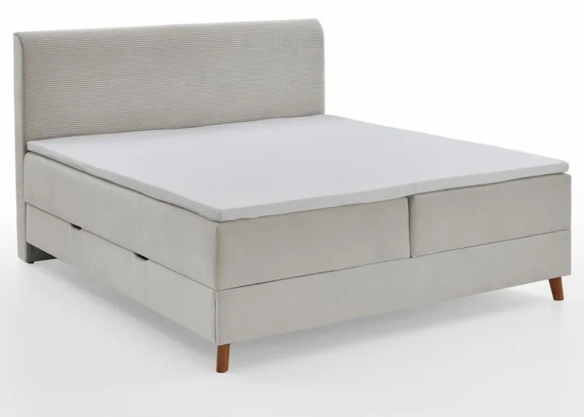 - Gestell aus Spanplatte mit Bezug in Cord-Stoff beige, Füße aus Massivholz in eichefarbig, Boxunterbau mit Bonellfederkern