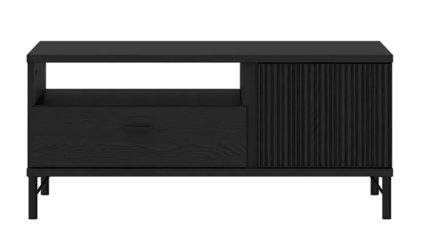 - Korpus aus Holzwerkstoff (Spanplatte) mit kratzfester Melaminharzfolie in Schwarz graphit, Front und Rillen aus Holzwerkstoff (MDF) mit hochwertiger Dekorfolie in Schwarz