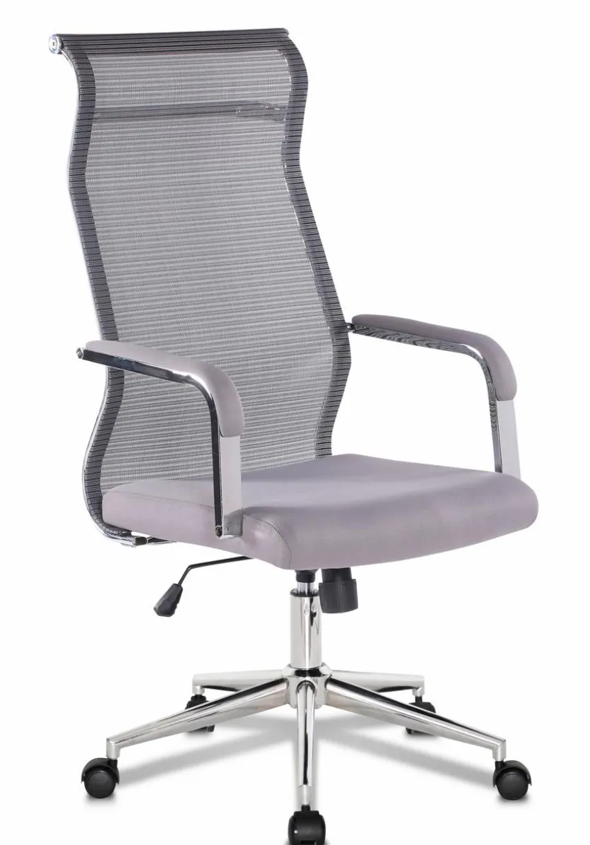 - Sitzbezug aus Stoff in hellgrau, atmungsaktiver Netzrücken in grau, Fußkreuz 35 cm aus Metall in silberfarbig