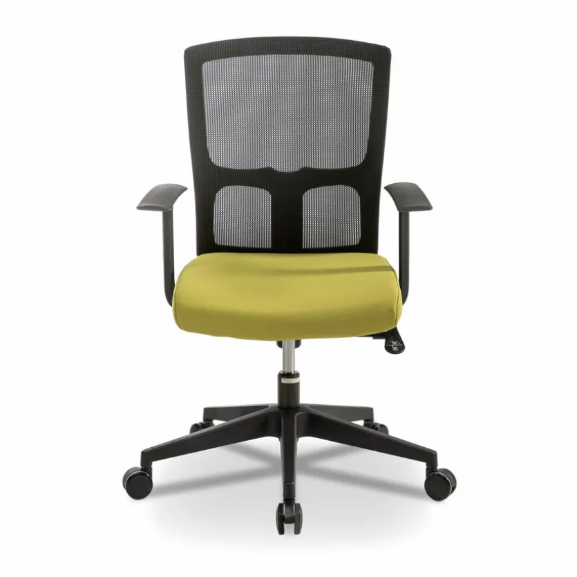 - Sitzbezug aus Stoff in grün, Rücken aus atmungsaktivem Netzbezug in schwarz, Fußkreuz aus Kunststoff in schwarz