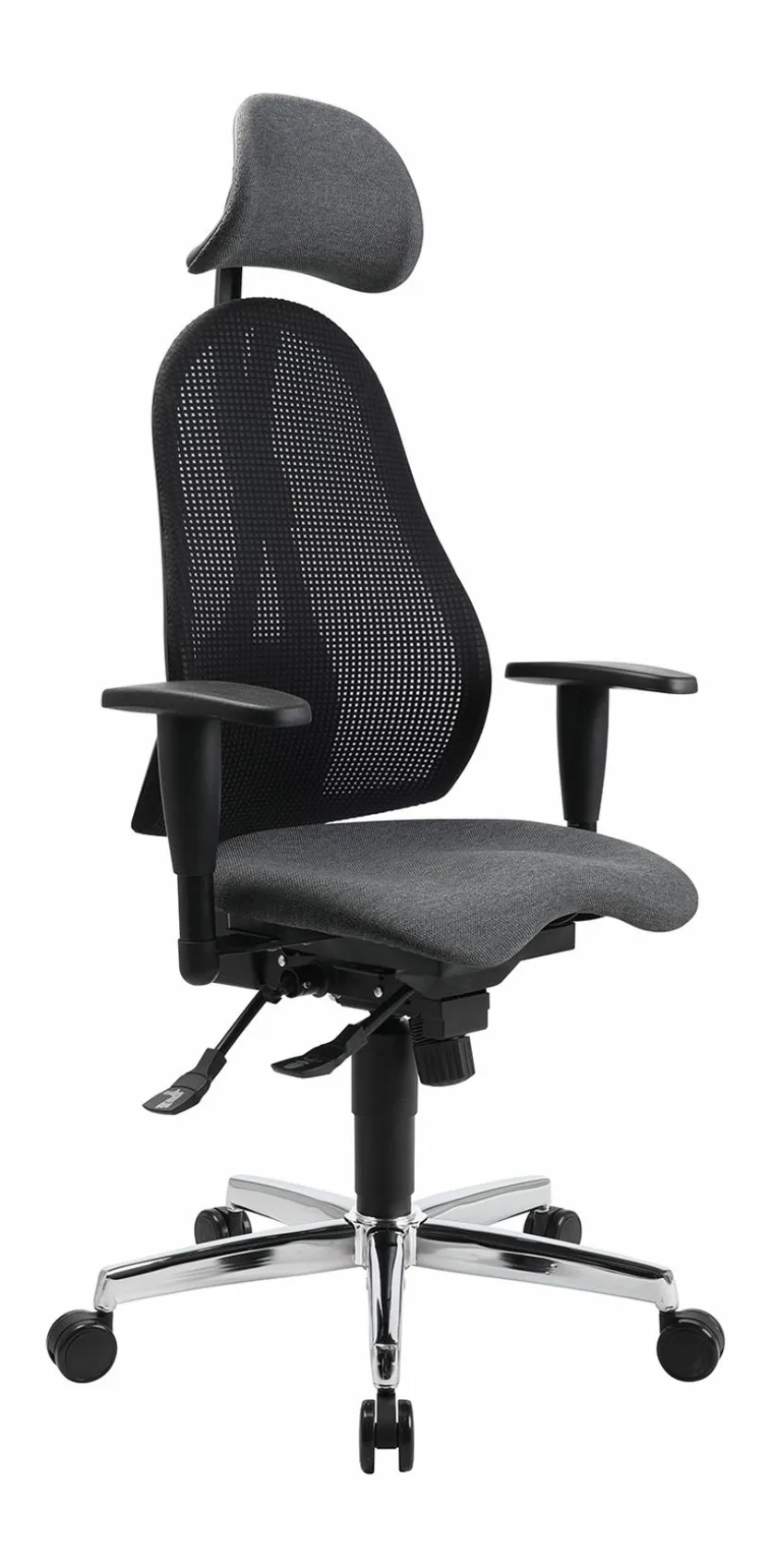 - Sitz aus Stoff in anthrazit, Rücken mit atmungsaktivem Netzbezug in schwarz