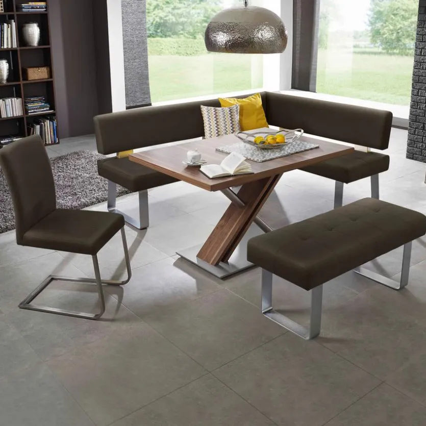 Starke Kufen aus silbernem Metall als Füße tragen die hochwertige Eckbank Game 4191, die mit einem pflegeleichten Bezug in edler Lederoptik ausgestattet ist. Sitz und Rückenlehne der soliden Eckbank Game 4191 bieten durch die komfortable Polsterung sehr gemütliche Plätze zum längeren Verweilen.