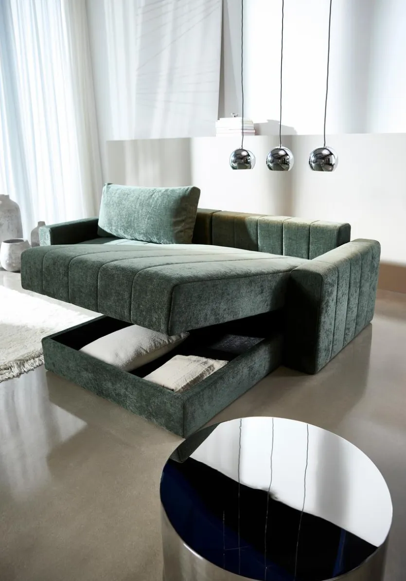 - Inkl. Schlaffunktion durch umklappbare Rückenlehne im 1-Sitzer und Bettkasten im Longchair