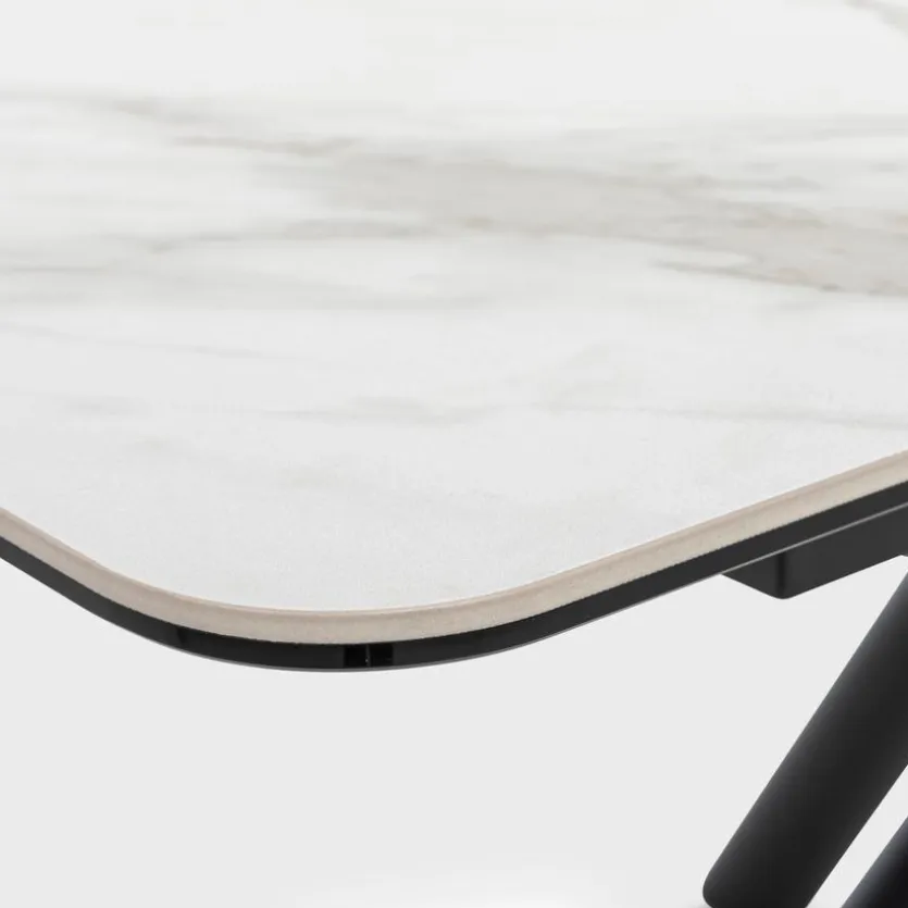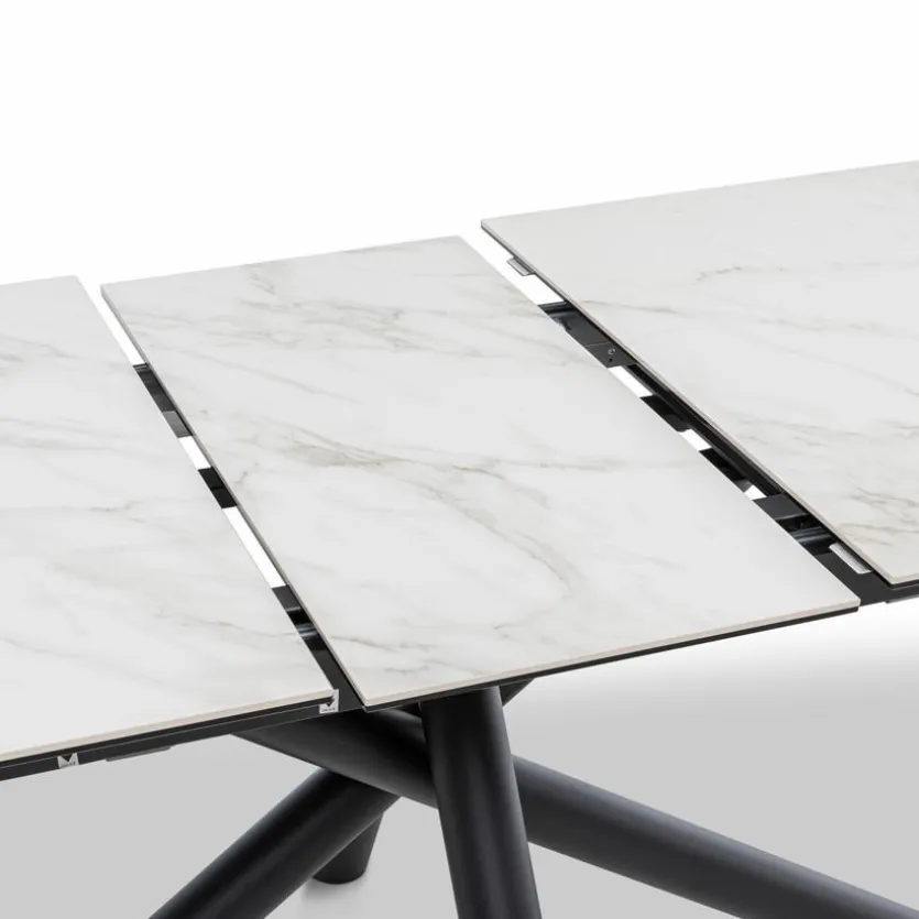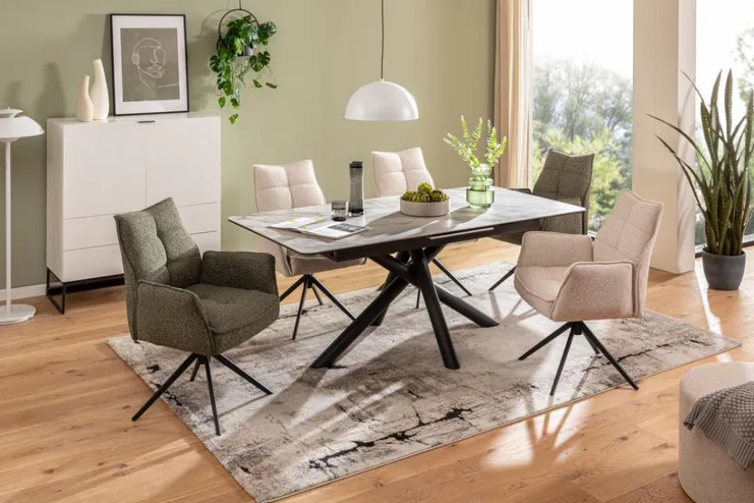 Der Esstisch mit Auszug Bayonne 180/220×90 cm ist wie geschaffen dafür, den Mittelpunkt Ihres Speisebereichs zu bilden. Besonders gefällt der Esszimmertisch mit seinem asymmetrischen Sternengestell und dem Kontrast aus heller marmorierter Platte und dunklen Tischbeinen. Versammeln Sie sich mit lieben Menschen um den Esstisch mit Auszug Bayonne 180/220×90 cm und genießen Sie geselliges Miteinander.