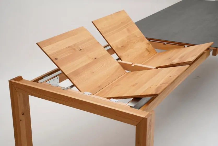 - Mit Gestellauszug in geölter Wildeiche auf ca. 280 cm (2×50 cm) ausziehbar