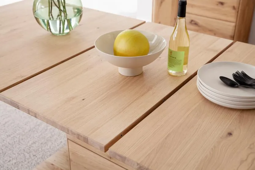 - Tischplatte aus Vollholz, Ast/Balkeneiche furniert in Kristalleiche geölt