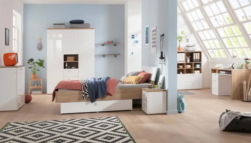 - Aus Spanplatte mit kratzfester Melaminharzfolie in Eiche Riviera Nachbildung, Absetzungen in Hochglanz weiß