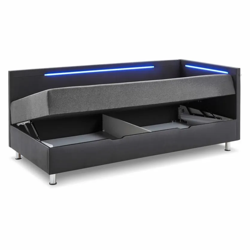- Gestell aus Holzwerkstoff (Spanplatte) mit Bezug aus pflegeleichter Lederoptik in schwarz, Matratzenbezug aus Stoff in anthrazit, Füße aus Metall in chromoptik