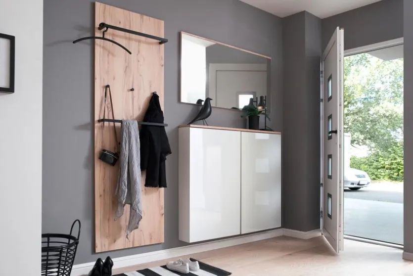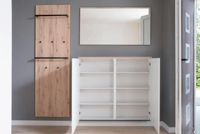 - Garderobe aus Garderobenpaneel, Schuhschrank und Spiegel