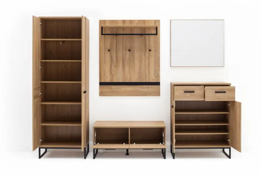 - Garderobe aus Garderobenschrank, Schuhschrank, Garderobenpaneel, Spiegel und Garderobenbank