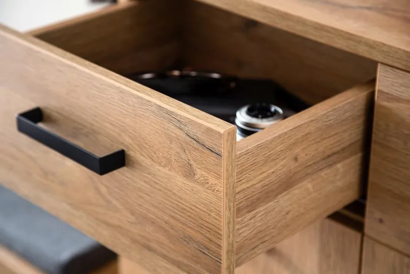 - Korpus und Front aus Spanplatte mit kratzfester Melaminharzfolie in Grandson Oak