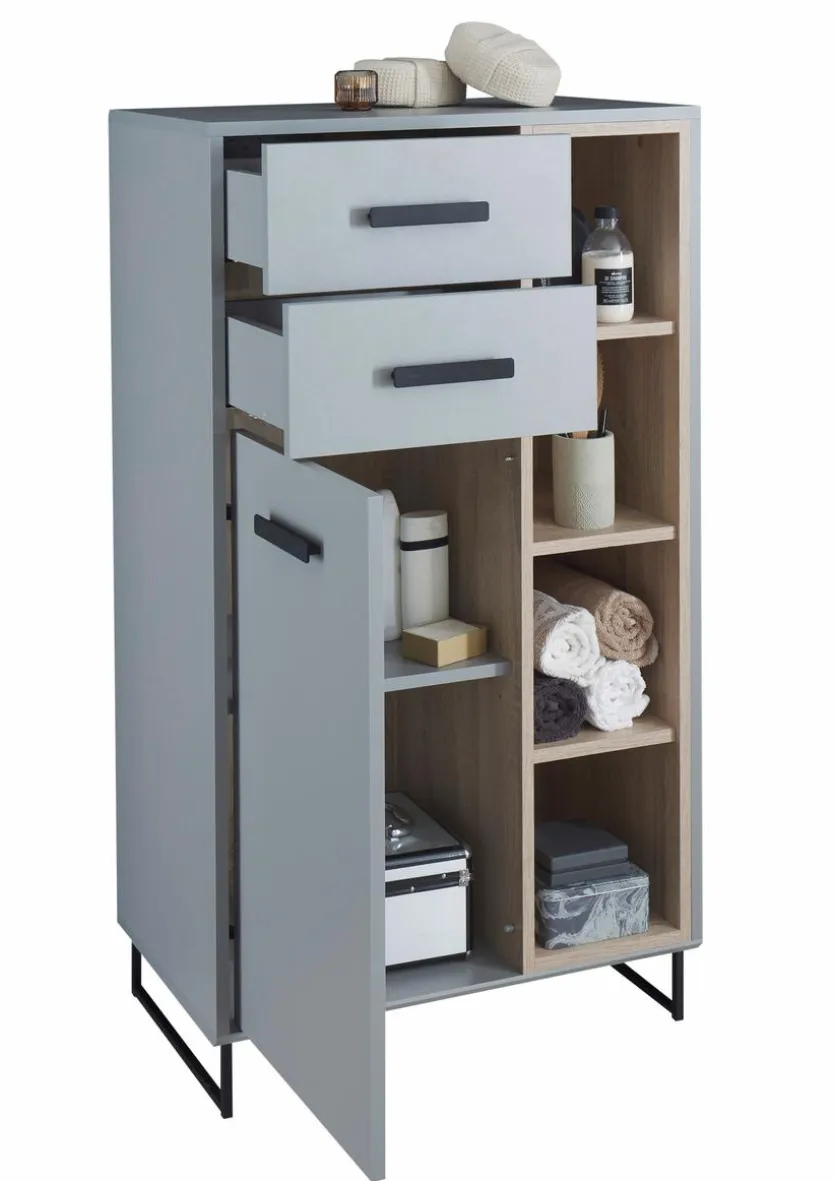Mit 2 Türen mit je 1 Einlegeboden, 2 Schubkästen und 1 offenes Fach mit 5 Böden