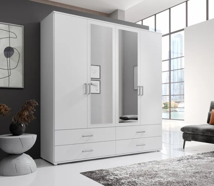 Der Drehtürenschrank Ivar von Pol Power überzeugt mit seinem schnörkellosen Aussehen und den integrierten Spiegeln sofort. Mit je vier Schubkästen sowie Schranktüren bietet er Ihren Lieblingsstücken viel Platz und schafft so im Handumdrehen Ordnung. Dank des tollen Designs passt der Drehtürenschrank Ivar außerdem zu vielen verschiedenen Einrichtungsstilen, was ihn zum idealen Möbelstück werden lässt.