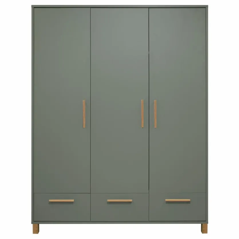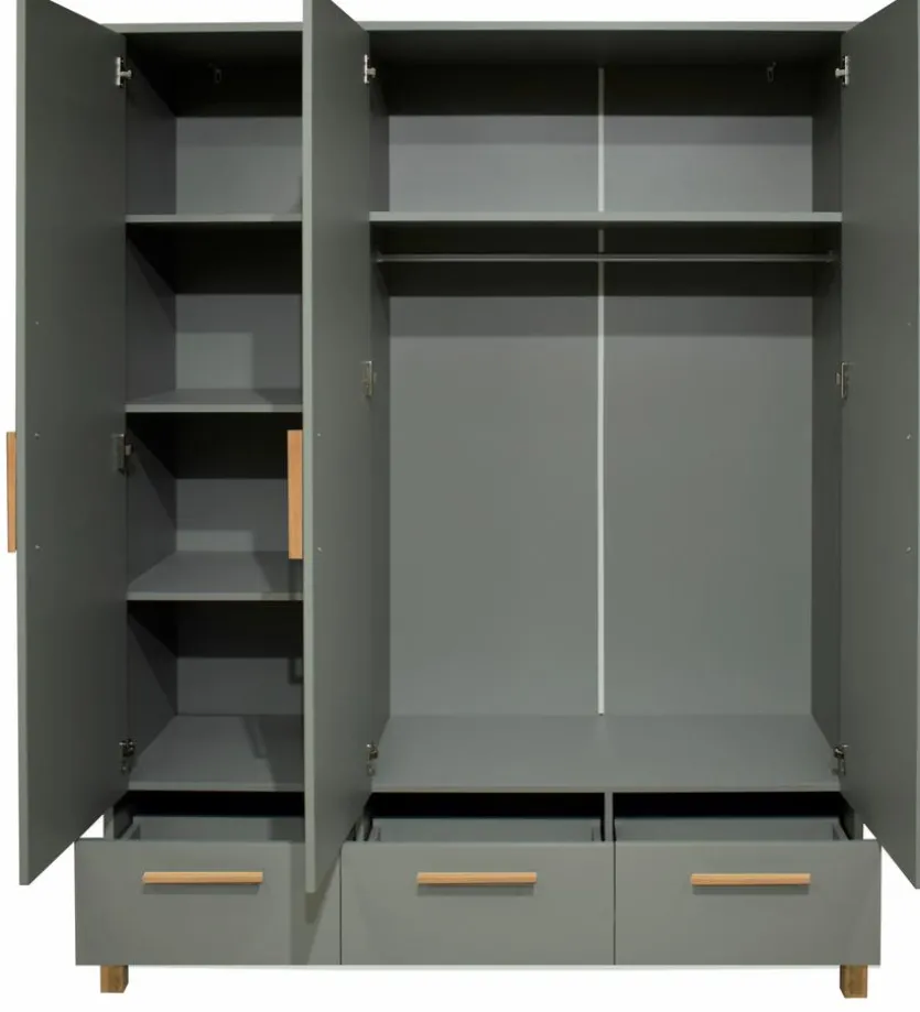 - Mit 3 Türen, 3 Schubkästen, 3 schmalen Böden, 1 breiten Boden und 1 Kleiderstange