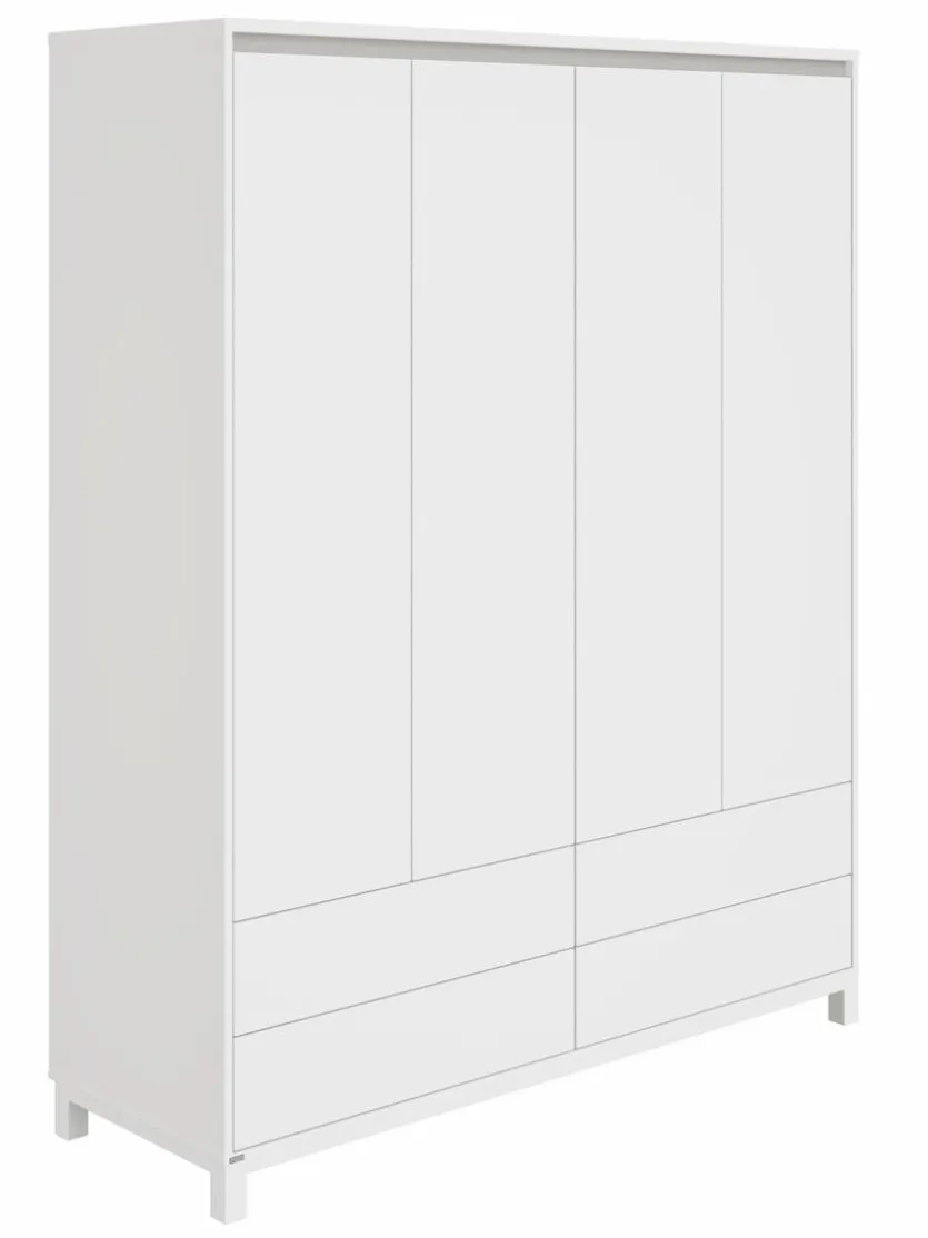 - Mit 4 Türen, 4 Schubkästen unten, 8 Einlegeböden und 2 Kleiderstangen