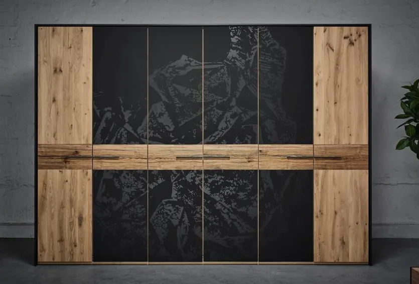 Der Kleiderschrank Steel 299×222 cm von Thielemeyer verbindet mit seinem interessanten Fronten-Mix den Charme rustikaler Holzmöbel mit dem klaren Purismus der Moderne. Dieser geräumige Kleiderschrank harmoniert mit ganz verschiedenen Einrichtungsstilen. In Ihrem Thielemeyer Kleiderschrank Steel 299×222 cm finden Sie nicht nur Platz für eine Fülle an Kleidungsstücken, sondern auch für Schuhe, Bettzeug und vieles mehr.