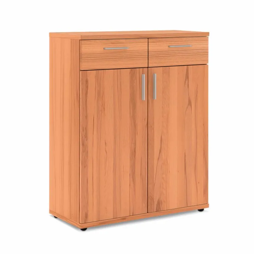 Die Front der Kommode Atlanta, Kernbuche ist aus Massivholz gefertigt, während der Korpus des Möbelstücks furniert ist. Hinter zwei Türen und in zwei Schüben gibt es Stauraum für diverse persönliche Gegenstände. Toller Eyecatcher: Die Schubkastenfront der Kommode Atlanta, Kernbuche präsentiert sich mit Reliefhobelung.[!NL]