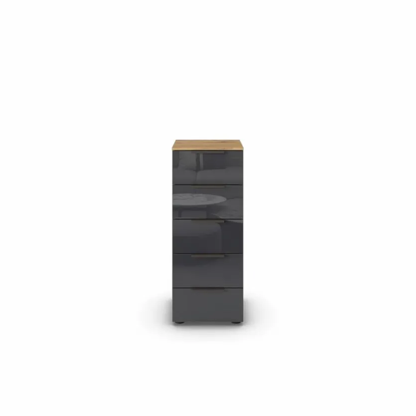 Mit der Kommode Flipp erhalten Sie ein optisch ansprechendes Möbelstück, dessen zeitgemäß wirkende Noten sofort positiv auffallen. Hierzu zählen der hochwertige Dekor-Druck und die mit Glas versehene Front aus Spanplatte. Außerdem bietet die Kommode Flipp viel Platz in den fünf Schubladen inklusive Softclose-Funktion.