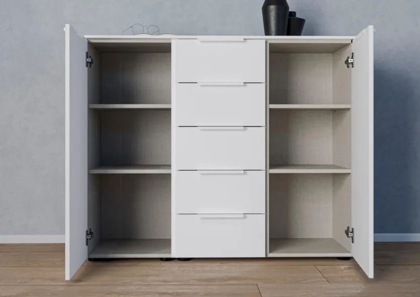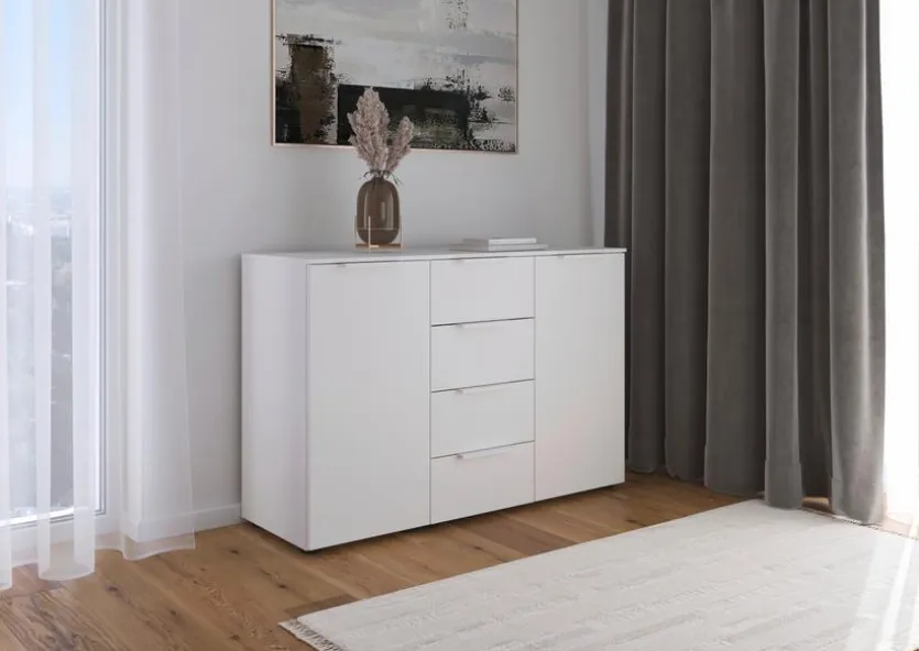 Funktionalität in Kombination mit eleganter Ausstrahlung kennzeichnen die Kommode Scale Box von rauch BLACK. Dank ihres schlichten Designs und der sorgsamen Verarbeitung ist sie ein langlebiges Lieblingsstück, das zu jeder Art der modernen Einrichtung passt. Hinter ihren beiden Türen und in ihren vier Schubladen bietet die Kommode Scale Box reichlich Stauraum für Kleidung, Haushaltsgegenstände und sonstige Dinge.