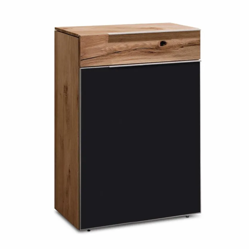 Ausdrucksstarkes, urgemütlich wirkendes Altholz kombiniert mit Schwarzglas – mit dieser spannungsvollen Mixtur zieht die Kommode Valpin aus dem Hause Voglauer die Blicke auf sich. Die klar und geradlinig gezeichnete Kommode Valpin von Voglauer ist mit einer Türe und einem Schub mit Vollauszug mit Soft-Abstoppung ausgestattet.