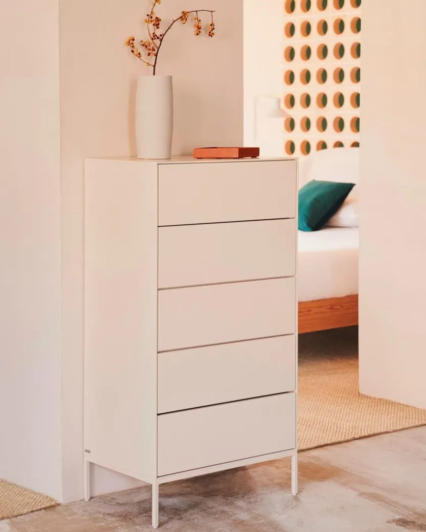 Die Kave Home Kommode Vedrana beeindruckt aus gestalterischer Sicht mit grifflosen Fronten, einer geradlinigen Formensprache ganz ohne Schnörkel sowie mit einem herrlich schlank gezeichneten, lackierten Metallgestell. Push-to-open-Systeme sorgen für Komfort im Alltag. Eine passende Option ist die Kommode Vedrana zum Beispiel für modern eingerichtete Räumlichkeiten im minimalistischen Stil.