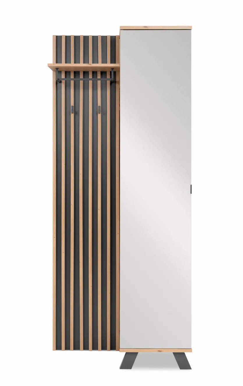 Die Kompaktgarderobe Medan verkörpert modernen Chic und überzeugt in puncto Funktionalität. Klar gezeichnete Konturen, eine große Fläche in Lamellenoptik und eine verspiegelte Front bestimmen den eindrucksvollen Look dieser Gaderobe. Dank des Schrankelements mit praktischen Einlegefächern wartet die Kompaktgarderobe Medan zudem noch mit jeder Menge Stauraum für Fashion-Accessoires, Schuhe und mehr auf.