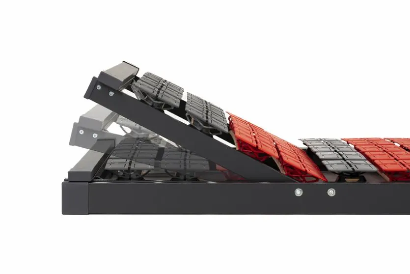 - Mit 70 einzelnen Tellermodulen in 2 unterschiedlichen Bauhöhen auf 14 Mehrschicht-Federholzleisten