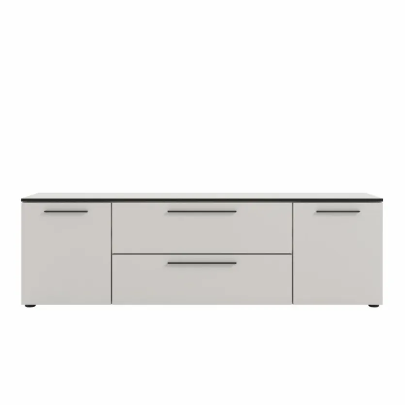 Das Lowboard Soul bietet hinter zwei Türen, einem Schubkasten und einer Klappe nützlichen Stauraum für Multimedia-Zubehör und andere Gegenstände. Seine Oberfläche hält Platz für den Fernseher bereit. Vier verstellbare Bodengleiter geben dem Lowboard Soul einen kippsicheren Stand. Das Sideboard ist mit schlanken Metallgriffen in horizontaler Ausrichtung ausgestattet, die das Öffnen der Fächer und Türen erleichtern.