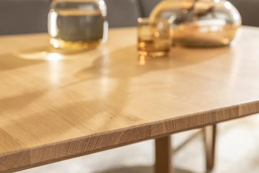 - Tisch mit Kreuzgestell in Eiche natur geölt mit gerader Tischplattenkante