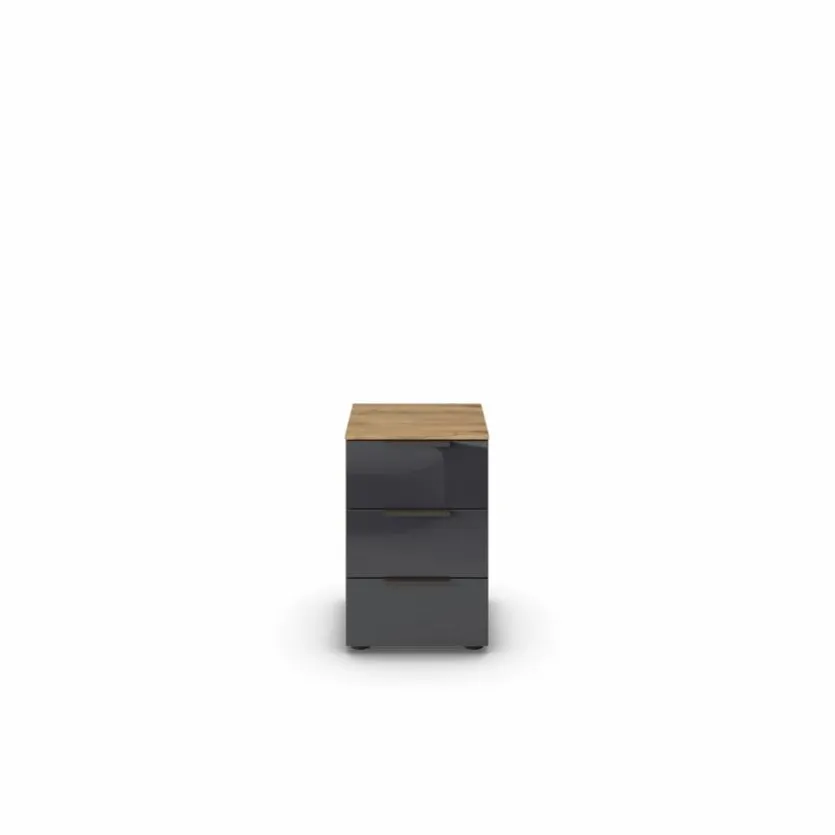 Mit drei Schubladen bietet die Nachtkommode Flipp reichlich Platz für Bücher, Zeitschriften oder etwa Hygieneartikel. Doch dieser Nachttisch ist nicht nur ungemein praktisch, er ist auch ein ästhetischer Gewinn für Ihr heimisches Schlafzimmer. Vor allem das geschmackvolle Zusammenspiel der Oberfläche in Holzoptik mit den schicken Spiegelgläsern verleiht der Nachtkommode Flipp ein ausgesprochen attraktives Erscheinungsbild.
