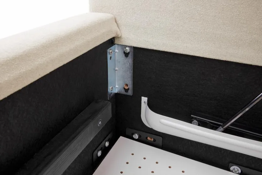 - Mit belüftetem Bettkasten und seitlich klappbarem Federholzrahmen, 28 Leisten mit 5-facher Härtegradverstellung, mit Mittelgurt und 5-facher Kopfteil-Rasterverstellung