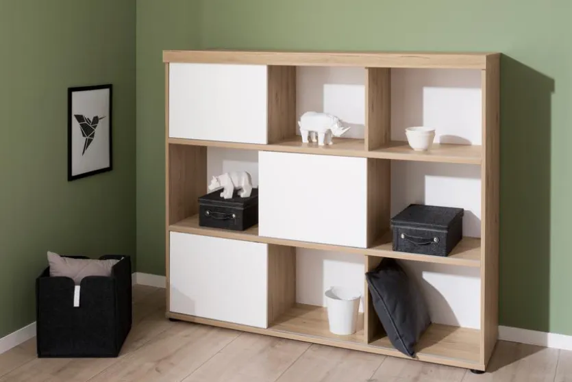 Mit dem Regal Fionn von Paidi ist für Ordnung im Kinderzimmer gesorgt. Schnell können Ihre Kleinen Spielzeuge, Bücher und vieles mehr in dem Wandregal unterbringen. Zu diesem Zweck hält das Regal Fionn aus dem Hause Paidi neun Fächer und drei Schiebetüren bereit.