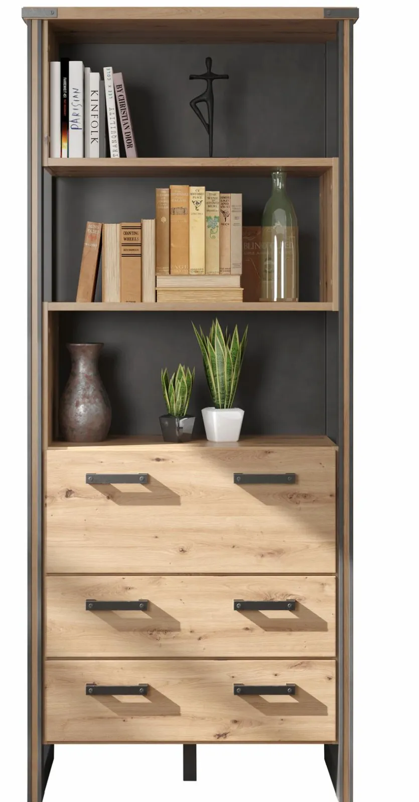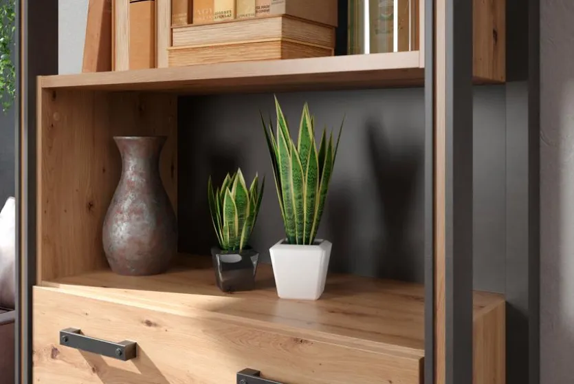 - Korpus und Front aus Holzwerkstoff (Spanplatte) mit hochwertiger Dekorfolie in Artisan Eiche Nachbildung, Absetzung aus Holzwerkstoff (Spanplatte) mit hochwertiger Dekorfolie in Matera Nachbildung