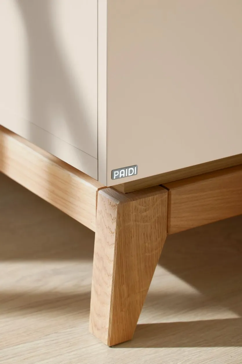 - Aus Holzwerkstoff (Spanplatte) mit kratzfester Melaminharzfolie in Cashmere-Beige, Füße, Griffe, Sockel und Deckplatte aus massiver Eiche