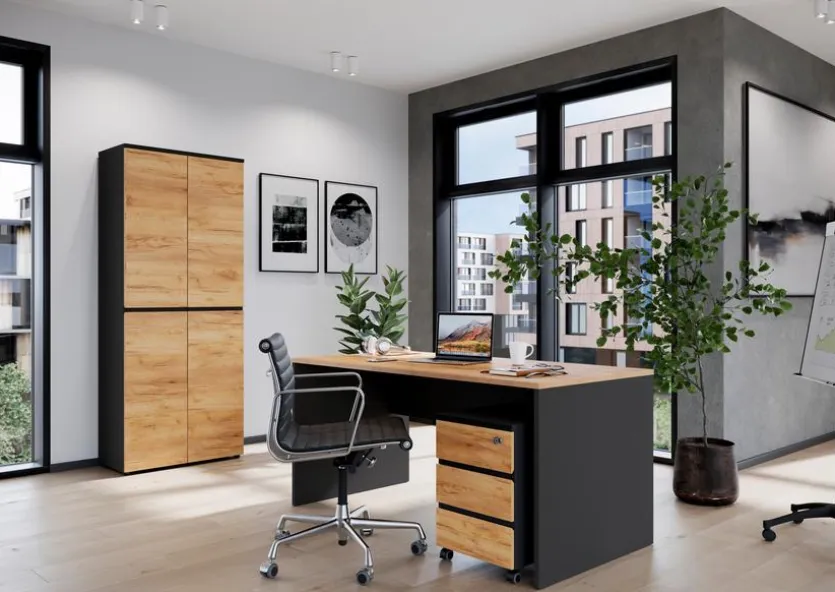 - Aus Holzwerkstoff (Spanplatte) mit kratzfester Melaminharzfolie in graphit, Schubkastenfronten in Eiche-Navarra-Nachbildung