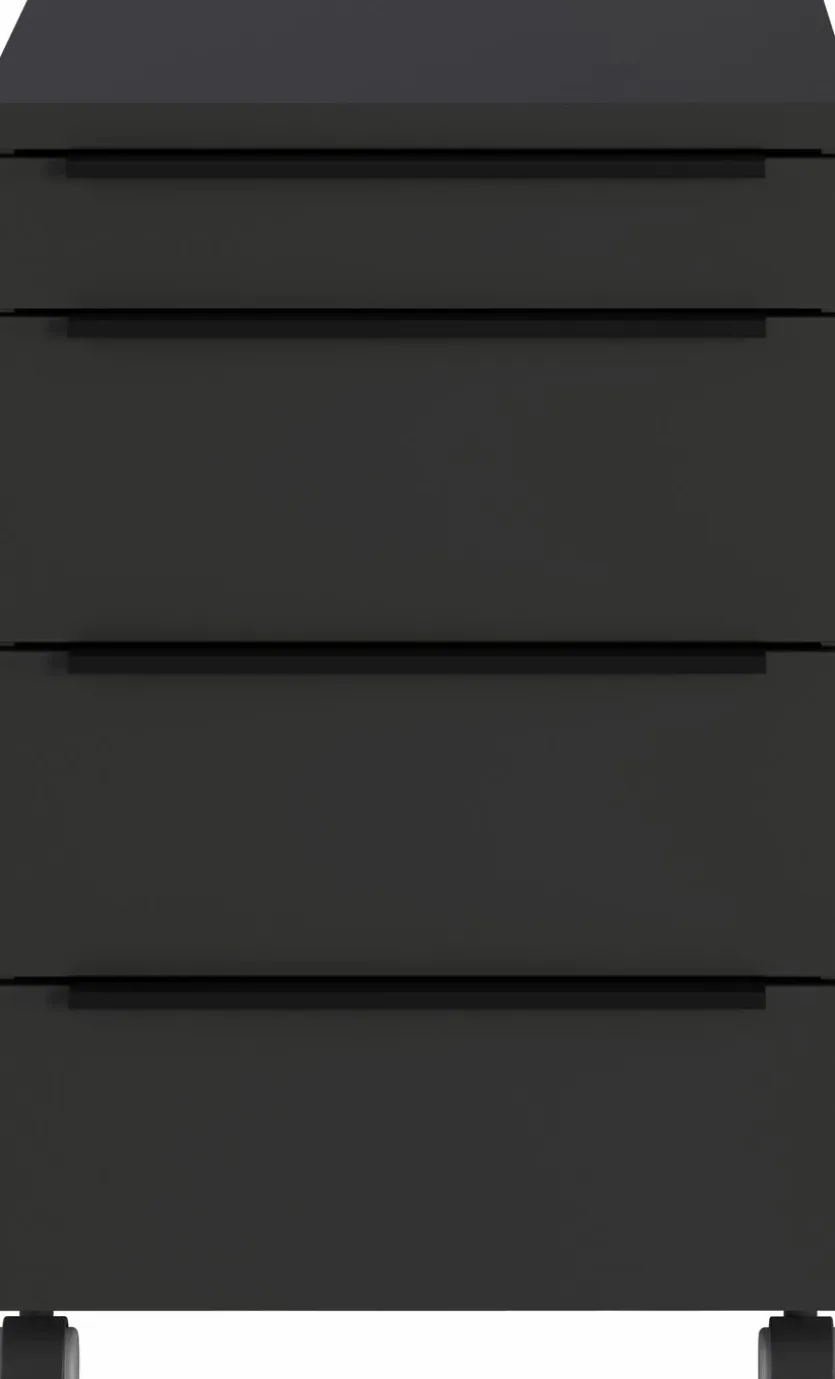 - Kantengriffe aus Metall in Schwarz, gummierte Laufrollen in Schwarz, 2 davon festestellbar