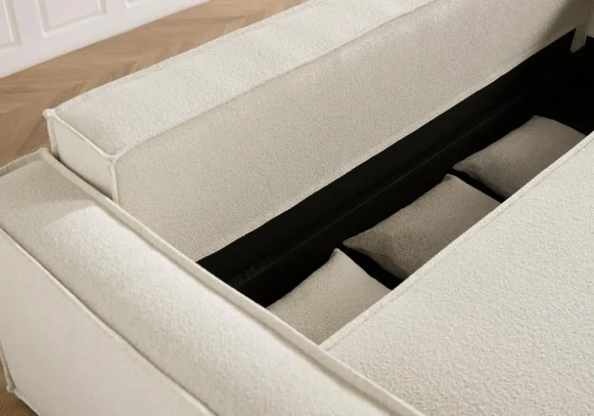 - Inkl. Schlaffunktion durch umklappbare Rückenlehne und Bettkasten