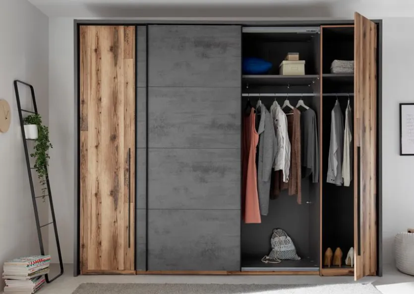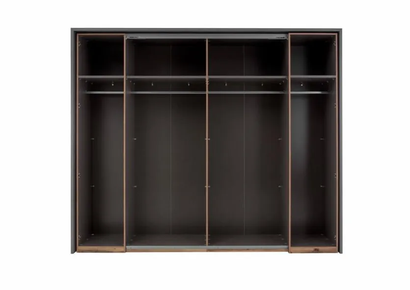 - Mit 2 Schwebetüren, 2 Außendrehtüren, 3 Mittelseiten, je 1 Fachboden und 1 Kleiderstange