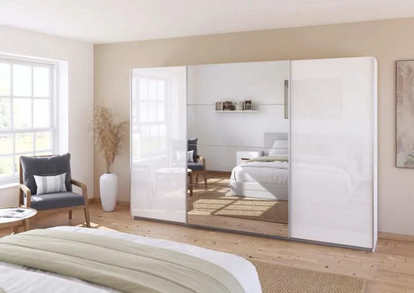 In modernem, klaren Design erscheint der Schwebetürenschrank Quadra 315×229 cm von rauch Orange und wertet so jedes Schlafzimmer auf. Eindruck macht dieser Kleiderschrank durch die große Spiegelfläche in der Mitte. Außerdem bietet der Schwebetürenschrank Quadra 315×229 cm viel Stauraum, um die gesamte Kleidung unterbringen zu können.