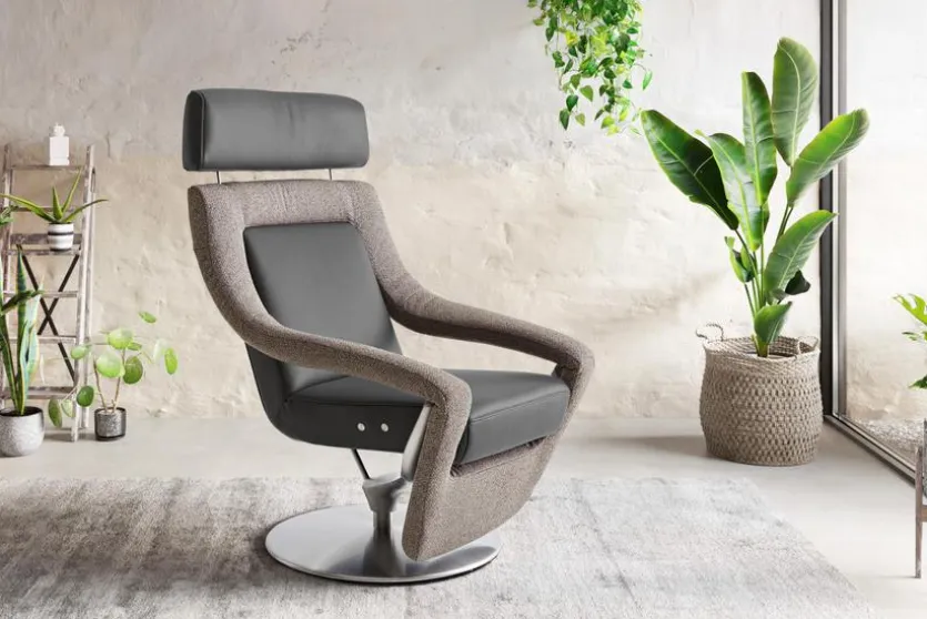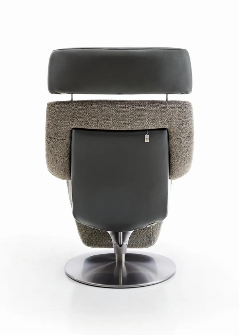- Bezug Rücken und Kopfteil (1) aus Leder (C-Classic) in pepper mit grauer Kontrastnaht, Bezug Arm- und Fußteil (2) aus Stoff (20-Rain) in beige/grau (93), Fuß Metalldrehteller nickel satiniert (Edelstahloptik)