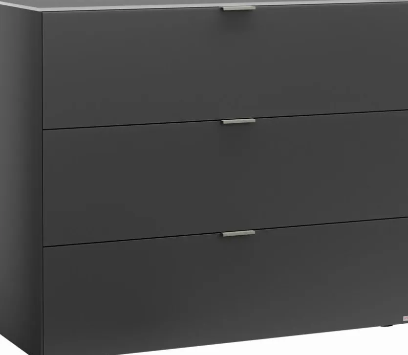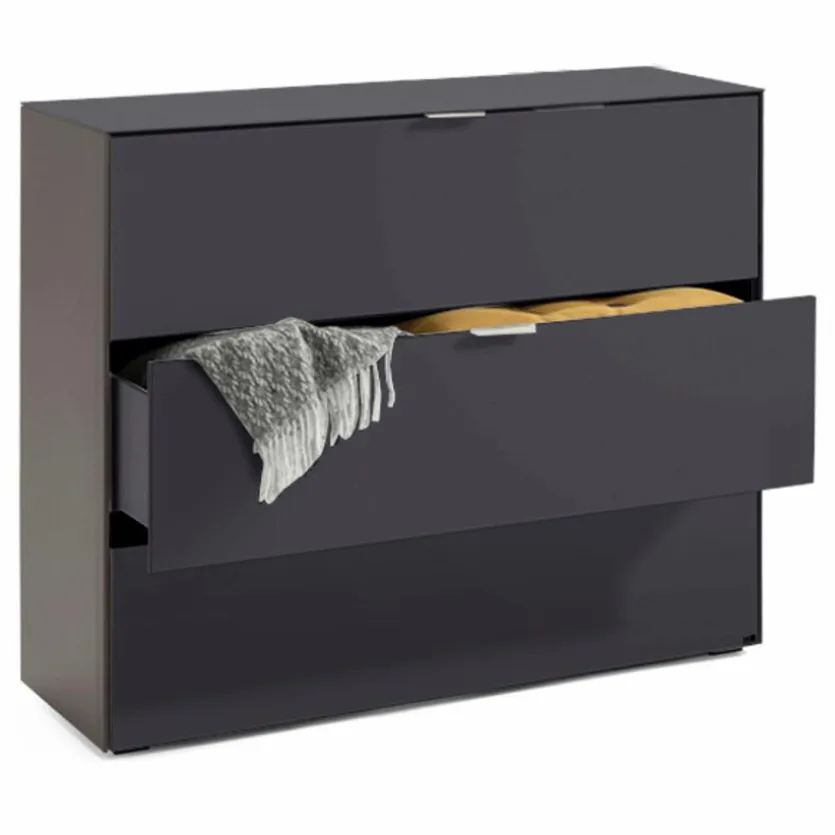 - Aus Holzwerkstoff (Spanplatte), Korpus mit kratzfester Melaminharzfolie in anthrazit matt, Front und Oberplatte aus Glas glänzend anthrazit lackiert