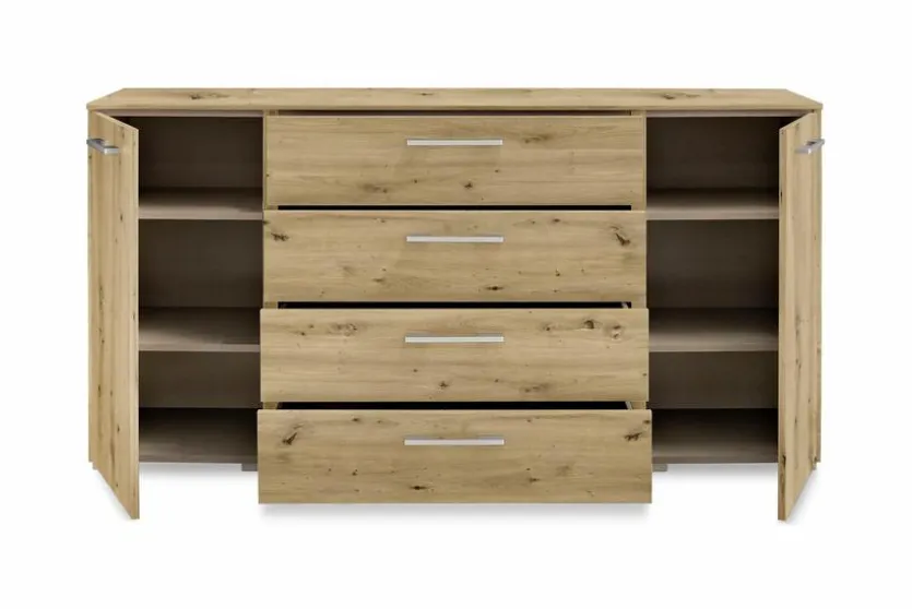 Mit dem Sideboard Henderson präsentiert Ihnen set one by Musterring ein überaus geschmackvolles und zugleich praktisches Möbelstück. Dank der warmen Holzoptik kreiert diese Kommode in Ihrem Zuhause eine einladende, geschmackvolle Atmosphäre. Zudem bietet Ihnen das Sideboard Henderson jede Menge Platz, um etwa Kleidungsstücke oder Gegenstände unterschiedlichster Art sinnvoll sortiert unterzubringen.
