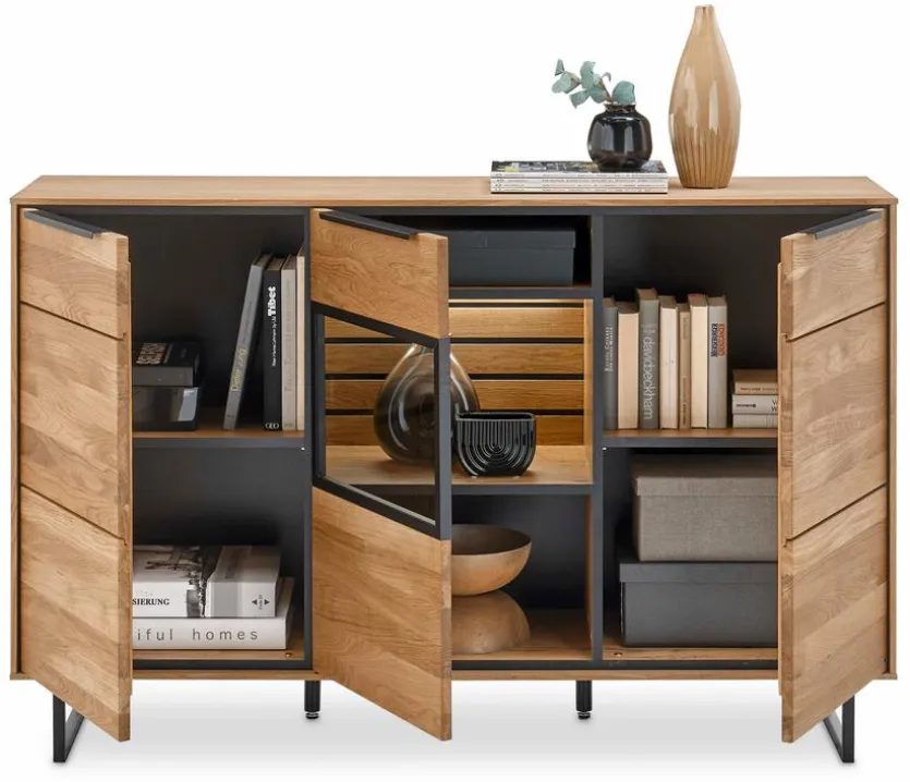 - Korpus aus Holzwerkstoff (Spanplatte) in Echtholz Eiche furniert, Front aus massiver Eiche